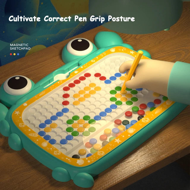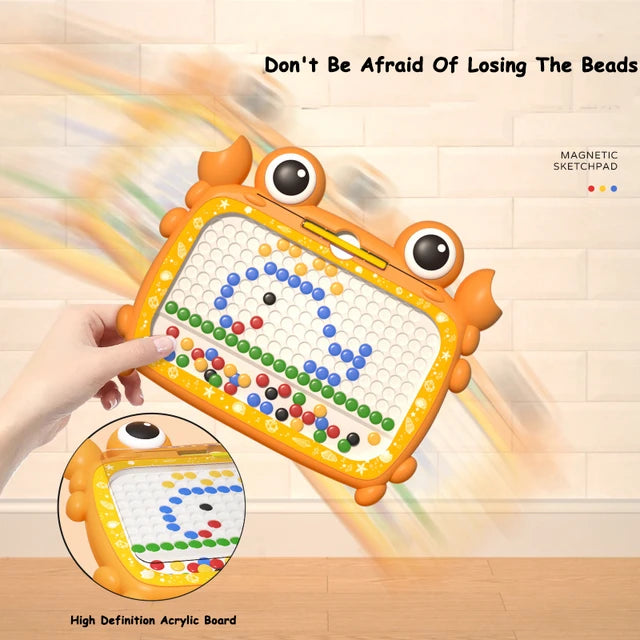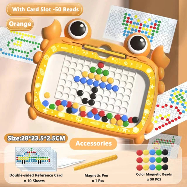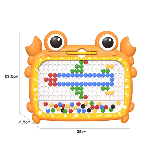 The Little Cute Crab Magnetic Drawing Board features two modes: Focus mode and Creation mode. Utilizing the included pen, children can freely express their creativity on the magnetic board by drawing various shapes such as planes, umbrellas, and hearts. For beginners, there is also a Focus mode with 7 cards and 14 patterns to guide them in placing colorful chocolate beans in corresponding positions, promoting simple operation and helping to maintain concentration. With rounded corners and safe, closed magnetic beads, this non-toxic and durable toy is designed to teach colors, shapes, counting, as well as fine motor skills, hand-eye coordination, cognitive abilities, and problem-solving. Perfect for children's educational and developmental needs, this Montessori toy is a must-have for any expert in the field.
