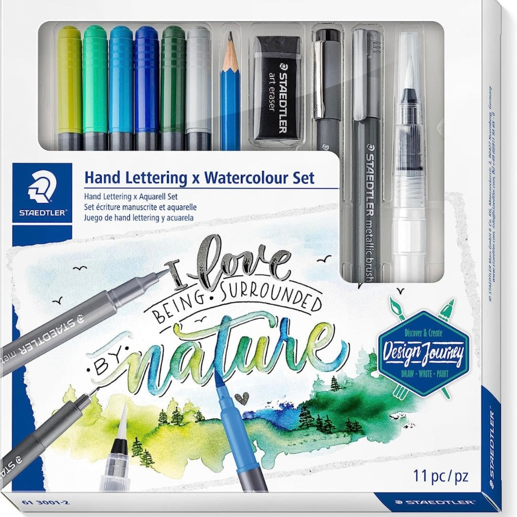 - Contents: 6 x coloured double-ended watercolour fibre-tip pens (3001) with brush tip for beautiful watercolour effects on most watercolour papers, 1 x black pigment liner (308 05-9 )for contouring and lettering, 1 x Mars Lumograph (100-2B) to sketch the baselines of the letteringand draw light pencils strokes, 1 x metallic brush pen in silver (8321-81) for creating lettering, 1 x water brush (949-M) for watercolours, 1 x art eraser (526 B30-9C)